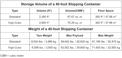 Weight and Volume of 40ft Shipping Containers in Lbs., Kgs., and Tons